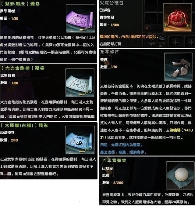 每日禮:「魅影劍法殘卷」3個,「大力金剛指殘卷」3個,「太極拳古譜殘卷」3個,火浣台,拓本碎片,百年雪蓮果。