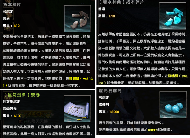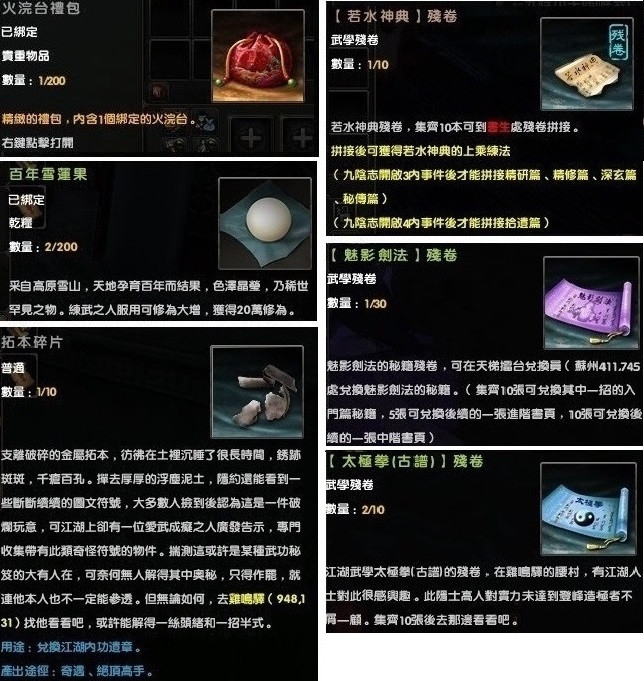每日禮:「魅影劍法殘卷」,「太極拳古譜殘卷」,若水神典殘卷,火浣台,拓本碎片,百年雪蓮果。
