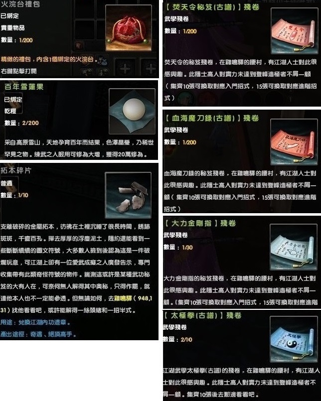 每日禮:「大力金剛指殘卷」,「太極拳古譜殘卷」,「焚天令殘卷」,「血海魔刀錄古譜殘卷」,火浣台,拓本碎片,百年雪蓮果。
