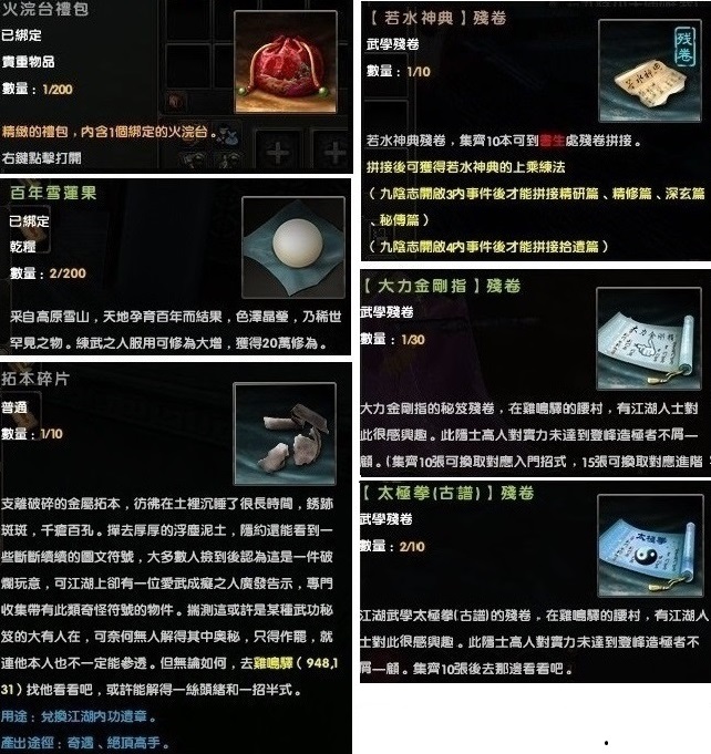 每日禮:「大力金剛指殘卷」,「太極拳古譜殘卷」,若水神典殘卷,火浣台,拓本碎片,百年雪蓮果。